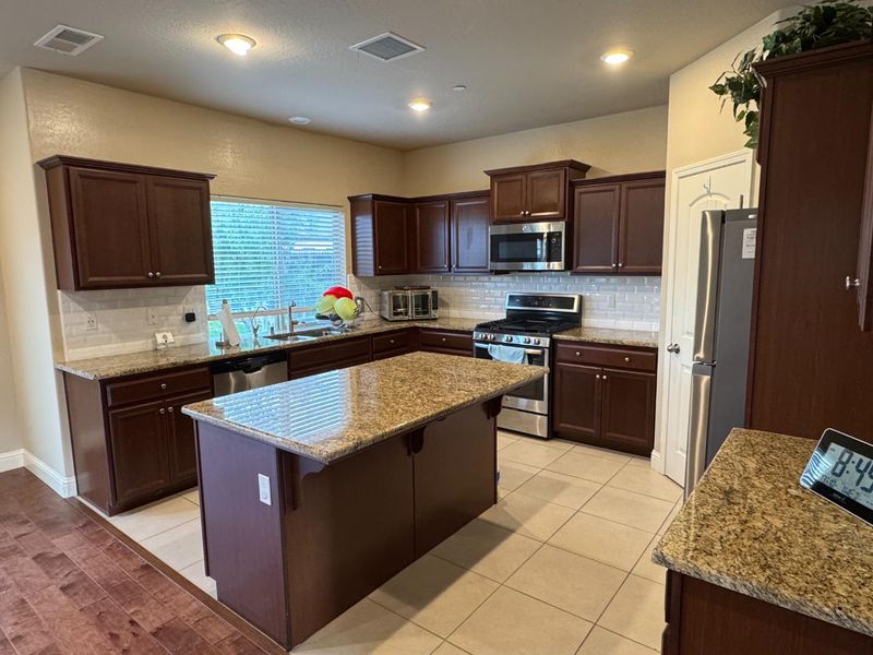 - 220 Volt Outlet, Cooktop - Gas, Countertop - Quartz, Dishwasher, Exhaust Fan, Garbage Disposal, Hood Over Range, Hookups - Ice Maker, Oven Range, Pantry