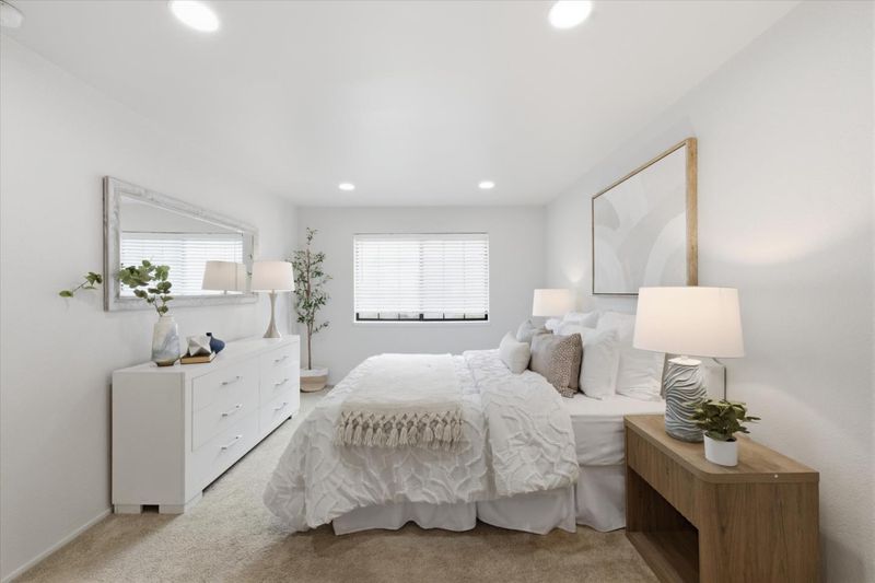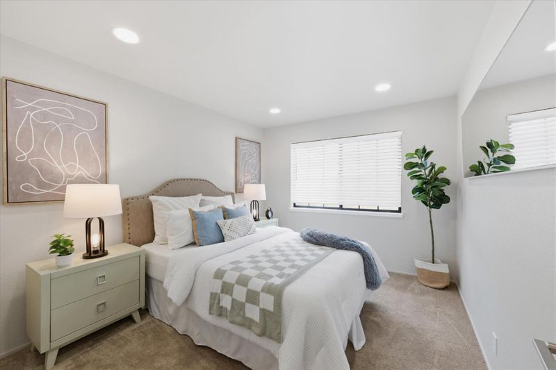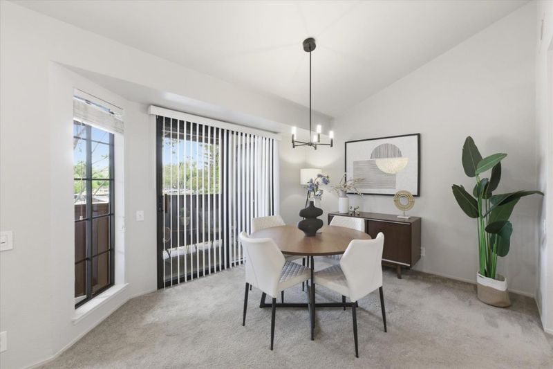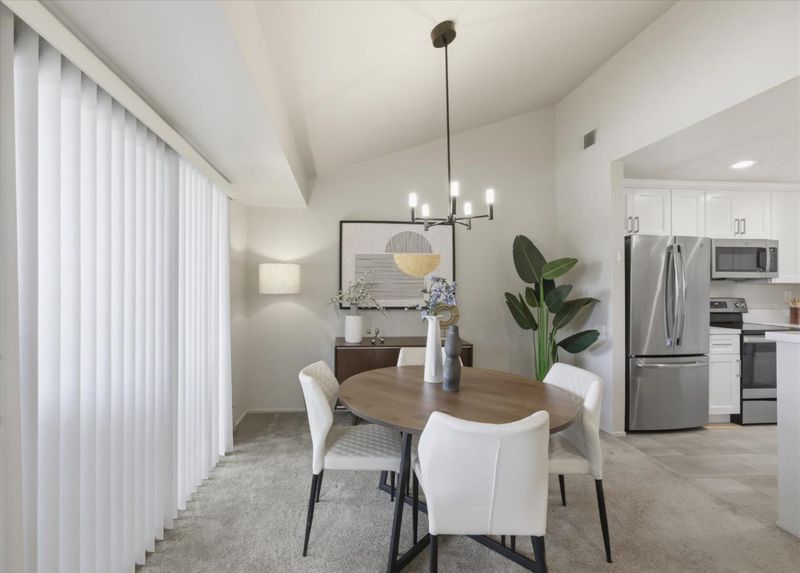 A Sanctuary of Contemporary Luxury! Step into a beautifully remodeled in 2021, top-floor condominium where natural light and modern design converge. The expansive living room features vaulted ceilings and recessed lighting throughout, creating an atmosphere of effortless sophistication. An elegant chandelier elevates the space, guiding your attention to a glass sliding door that opens to a sunny, covered outdoor patio-an ideal extension of your private living space.The remodeled and open kitchen is a testament to style, featuring shaker-style cabinets, sophisticated quartz counters, and stainless steel appliances. Retreat to the spacious primary suite with ample closet space, an updated vanity and countertop, complete with a shower with tile surround and glass enclosure. A guest bathroom features a newer shaker-style vanity, and quartz countertop, ensuring both comfort and style for your guests. Additional features include: Indoor washer & dryer, central heating and air conditioning, elegant single panel interior doors, natural lighting throughout and 2-car tandem garage. Prime location in the back of a well maintained complex with swimming pool, club house & convenient to park, shopping, downtown Mountain View & Sunnyvale + easy access to freeway & expressway. You will love it !