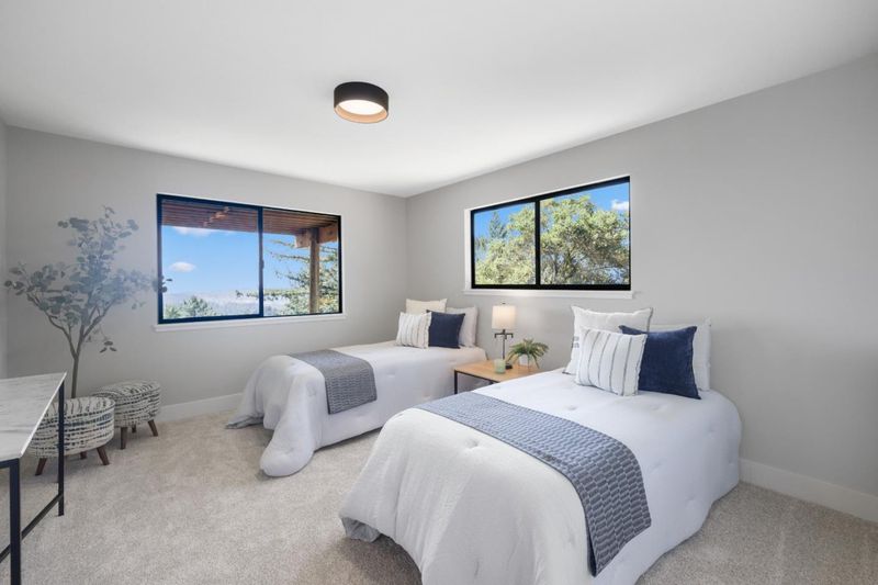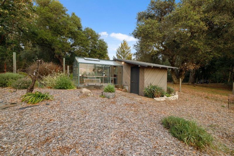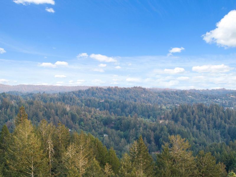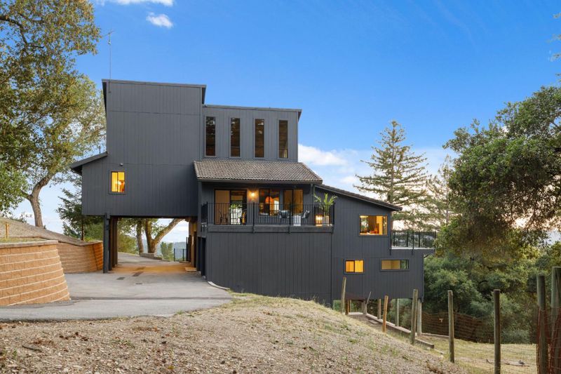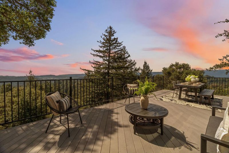 Perched on 10 acres in the Santa Cruz Mountains, this turnkey 3-bed/3-bath ridgetop estate offers sweeping panoramic views stretching to the white sand beaches of Monterey . An oversized wrap-around deck sets the scene for al fresco dining, sunset cocktails and morning coffee. The home has been thoughtfully renovated including updated carpet, paint and appliances. The kitchen is built for cooking enthusiasts, including dual KitchenAid ovens, generous counter space, breakfast nook and a formal dining room ideal for entertaining. Above the main living area, a mezzanine overlooks the dining space, adding architectural interest and flexible use. The primary suite features a custom built-in dressing room and a spa-like bathroom with an oversized soaking tub framed by views of the grounds. Two additional bedrooms are thoughtfully situated on the lower level alongside a bonus flex space well-suited as a home theater, library or second family room. Outside the property caters to gardeners and hobbyists, with a charming greenhouse, a deer-proofed garden area, and multiple flat usable acres ready for whatever you envision. Perhaps a compound or ADU, thanks to the ready to use trailer hookups. Whimsical, private, and rarely available, this is a legacy property in every sense.