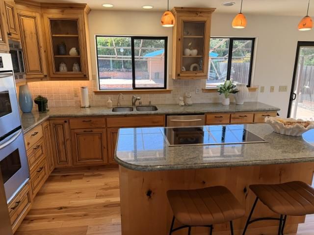- Cooktop - Electric, Countertop - Granite, Dishwasher, Exhaust Fan, Garbage Disposal, Island, Microwave, Oven - Double, Refrigerator