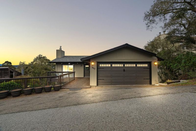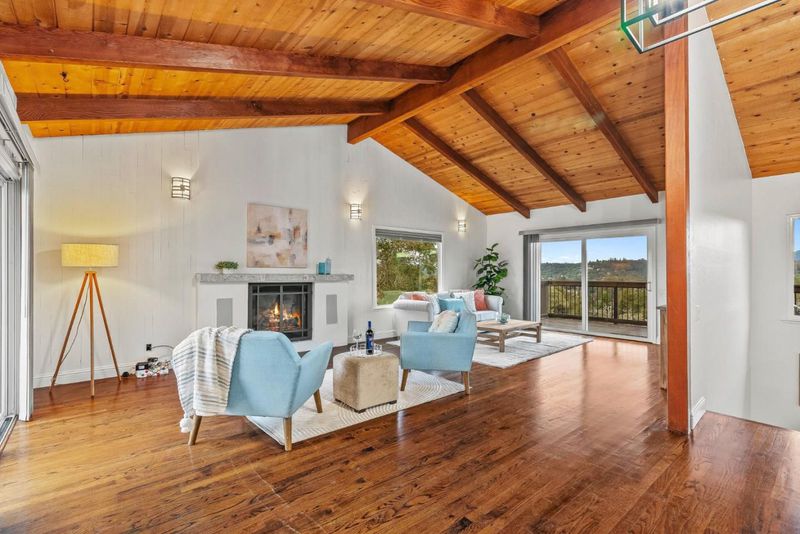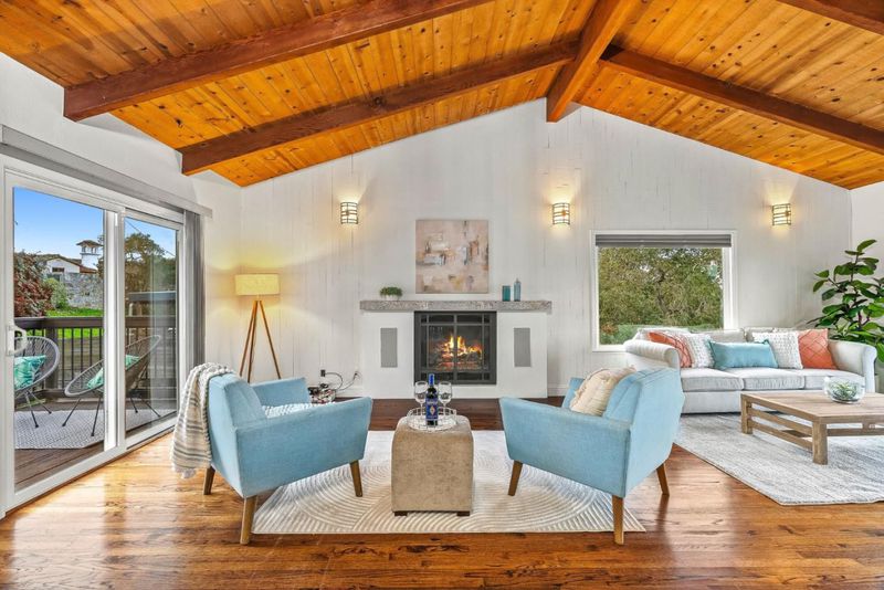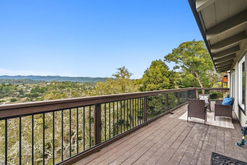 Perched above Rio Del Mar, this 2,120 sqft home features 3 bedrooms, 2.5 baths with sweeping views of the Aptos Hills and an ocean peek-a-bo. The living room boasts hardwood floors, vaulted natural wood beam ceilings, & a cozy fireplace. Large windows fill the space with natural light & showcase the surrounding scenery. The open layout seamlessly connects the living room, kitchen, & dining area, ideal for gatherings or casual nights at home. The kitchen is beautifully remodeled with quartz countertops, Shaker cabinetry, high-end stainless steel appliances, a Miele cooktop and ovens, and a granite composite sink, offering both style and functionality. Updated bathrooms feel fresh and modern, with marble showers, a jetted shower panel, designer light fixtures, and plenty of storage. Downstairs, an efficient hydronic radiant heating system with individual room controls keeps the home comfortable year round. Recent updates include a new roof and a two car garage. Expansive decks off of the back of the home back offer outdoor space to relax & take in the panoramic views. Situated on a quiet street yet just minutes from the beach, golf, and all the shops, restaurants, and amenities of Aptos, this home offers easy, relaxed living in a stunning setting.