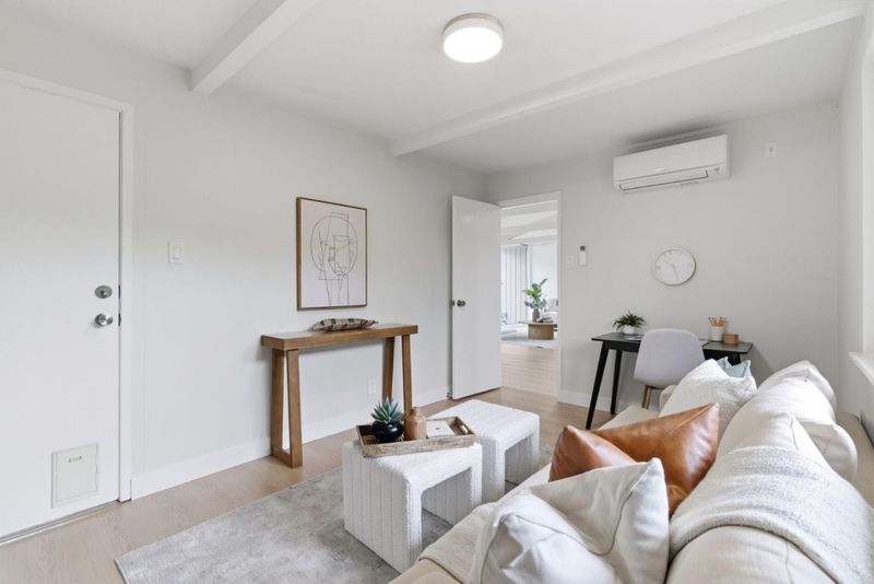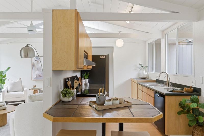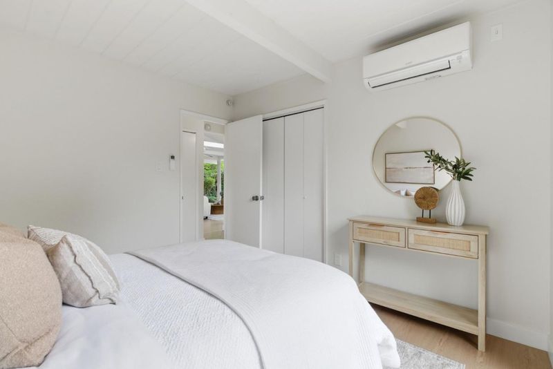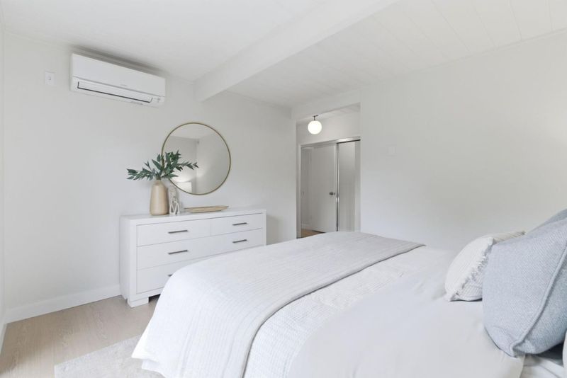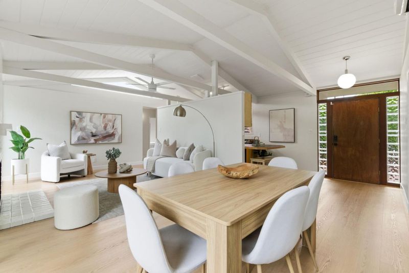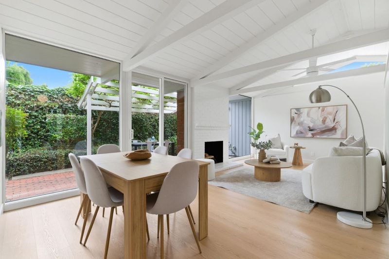 This charming Monta Loma Eichler embodies a blend of classic features such as open beam ceilings and globe lighting with many modern upgrades such as double pane windows, mini split systems, 200amp electrical panel, and PVC roofing. Enter through a private gated side courtyard. Inside a bright open space creates a tranquil flow between the kitchen, living and eating areas. Wall-to-wall panels of glass flank a painted brick wood burning fireplace. The kitchen has refinished Oak cabinetry, eating peninsula, new electric range and stainless steel refrigerator with large window overlooking the side courtyard. The primary bedroom features an ensuite bath with new tub and subway tile surround, new wood vanity, as well as its own sliding door access to the yard. In addition there are two well appointed bedrooms with sliding doors from each to the yard, and a hall bathroom with a new vanity, mirror and light fixture. Half the garage has been converted to an office/family room with built-in bookshelves. Beautifully landscaped yards that wrap around the property with lawn, pond, seating areas on both sides. Walk to Monta Loma Elementary, Thaddeus Park. Less than 2 mi to Googleplex, San Antonio Shopping Center,, Rengstorff Park, Shoreline Park and Baylands Nature Preserve trails.