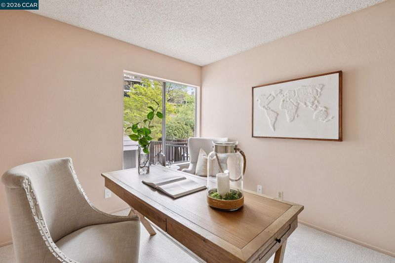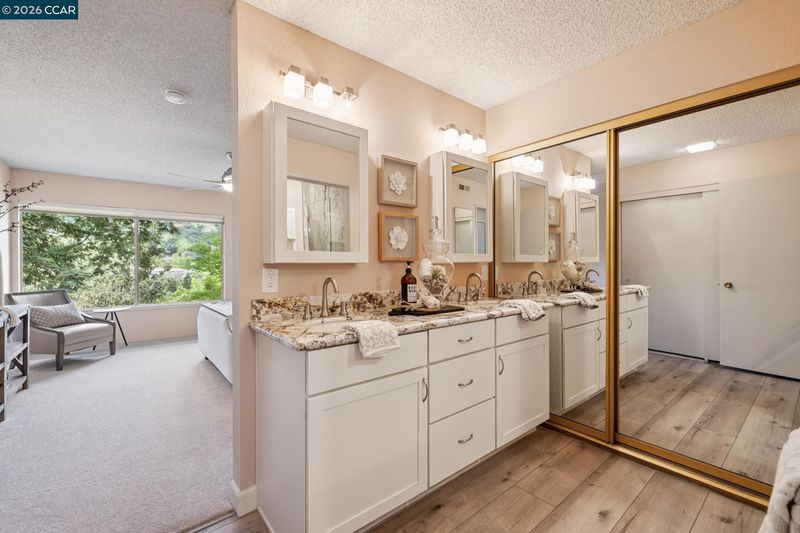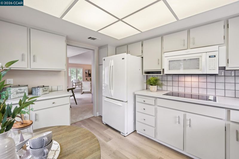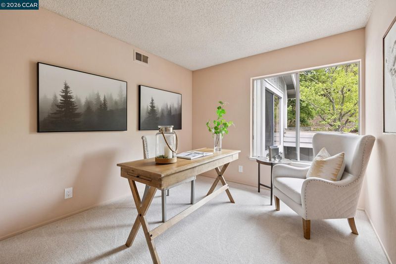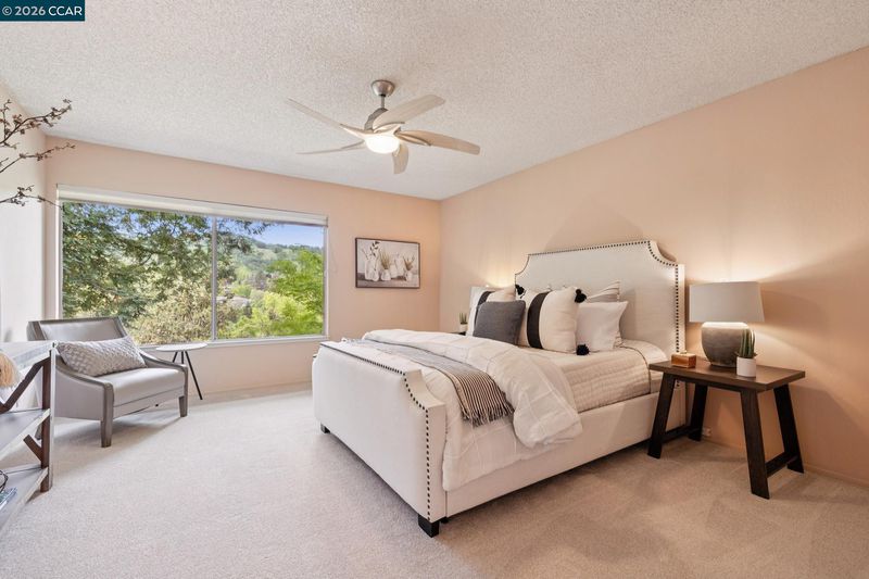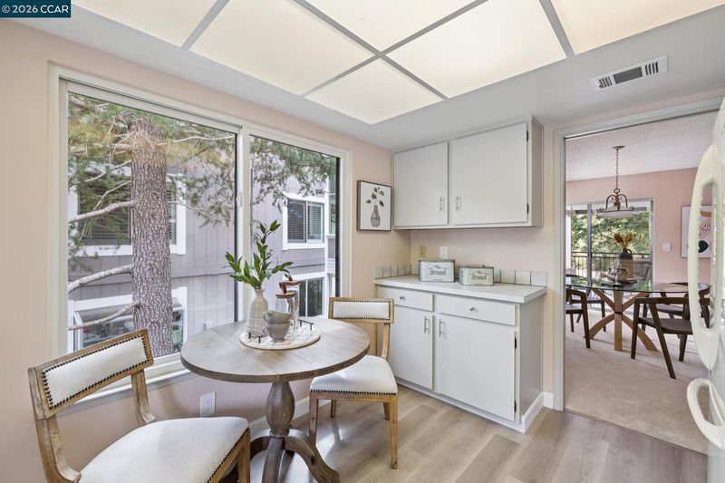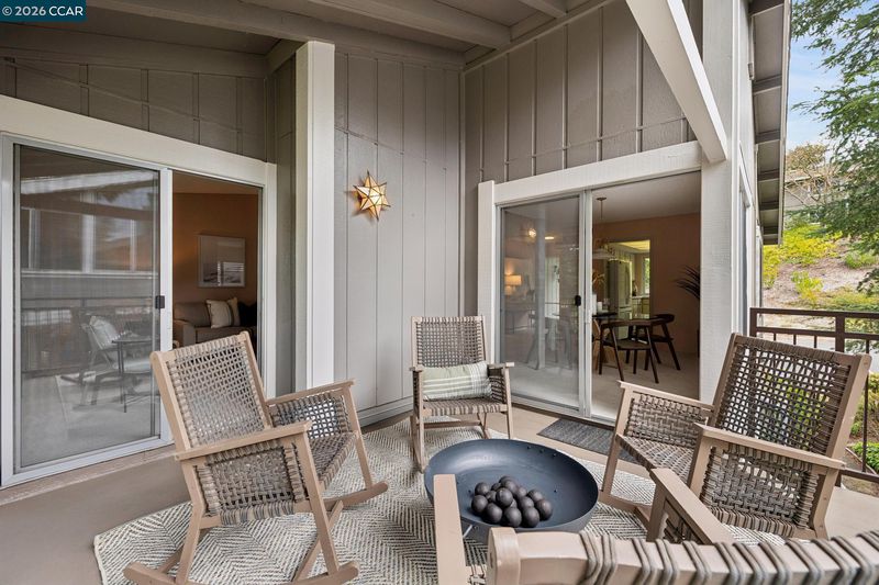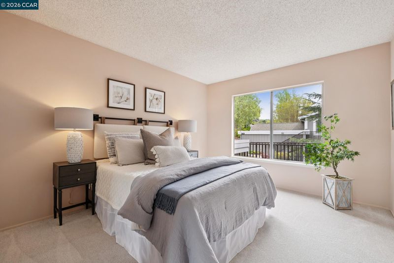 Welcome to this spectacular Tahoe model, one of Rossmoor’s most desired floor plans. This upper level end unit offers extra privacy with a stunning view of the western hills. Both the dining room and living room have slider doors with access to the spacious open deck. In the cooler weather, the cozy wood burning fireplace in the living room provides extra warmth. Double pane windows, new luxury vinyl plank flooring and sparkling white appliances in the kitchen enhance the beauty of this room. Entering the primary bedroom you are greeted with another beautiful view of the western hills. Both the primary bathroom and the hall bathroom have been updated. The primary bathroom sports a gorgeous tile lined walk-in shower with a built in seat and marble counter tops surrounding the double sinks. The hall bathroom also has a walk-in shower and marble sink counter tops. Vaulted ceilings, new carpet, vinyl plank flooring and plantation shutters all add to the charm of this home. This property is freshly painted with custom blended paint, professionally cleaned and ready to welcome it’s new owners.