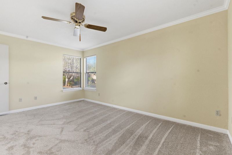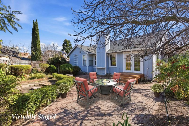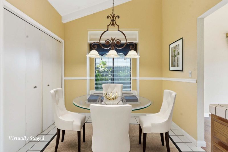 Welcome to this well-maintained home with mature landscaping, brickwork, a wrought iron front gate entrance, and a backyard patio/deck which provides comfortable outdoor living space. The living room features a wood-burning fireplace with travertine surround. Laminate flooring flows through the main living areas and into the third bedroom. The third bedroom has built-in shelving in place of closet doors, offering a flexible space for an office, den, or guest room. Carpet is in the primary bedroom and one additional bedroom. Blinds are installed in all rooms except the living and dining areas, and a chandelier highlights the dining space. The kitchen has tile countertops, original cabinetry, a breakfast nook with a decorative light fixture, dishwasher, range, range hood, and a conveniently located laundry closet. The primary suite includes a walk-in closet with cedar flooring and a private bath with marble flooring in the toilet and shower area. The hall bath features a shower-over-tub. Additional features include ceiling fans in all bedrooms, a two-car garage, and a composition roof. Make this charming house your new home today!