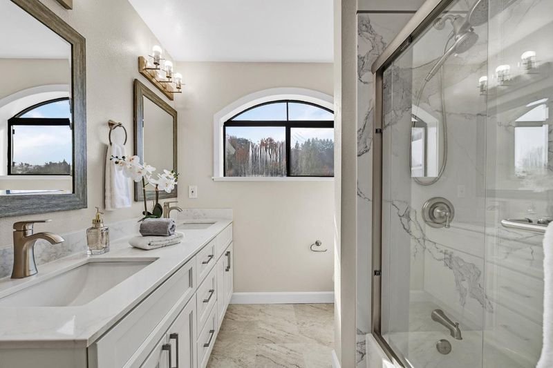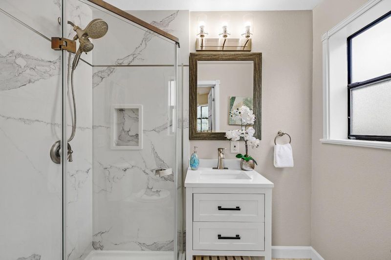 - Double Sinks, Full on Ground Floor, Primary - Stall Shower(s), Shower over Tub - 1, Solid Surface, Stall Shower - 2+, Updated Bath