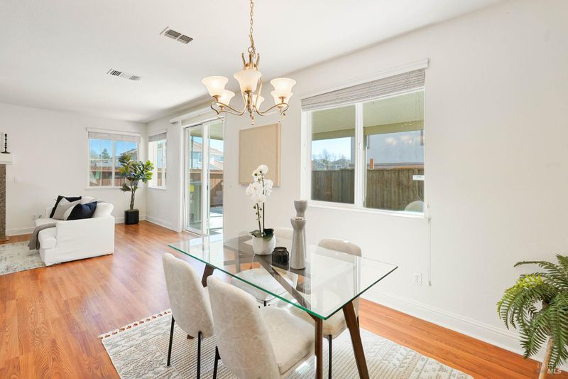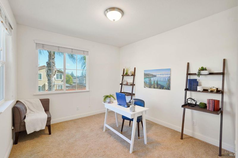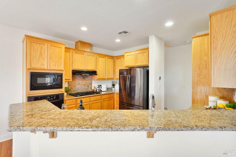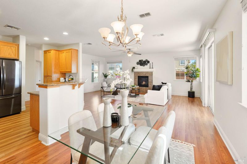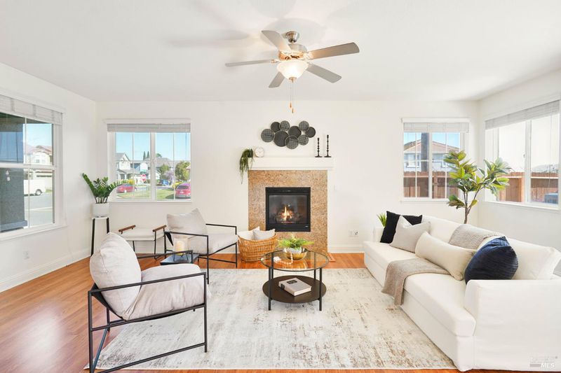 Welcome to this beautifully maintained 3-bedroom, 2.5-bath two-story home in the desirable Gold Ridge community, offering scenic hill views and true move-in-ready convenience. The spacious living room and dining room combo creates an open, versatile layout perfect for everyday living and entertaining. Warm simulated wood flooring, fresh interior paint, and a cozy gas fireplace add comfort and style throughout the main living area. The updated kitchen features granite countertops, rich wood cabinetry, and ample workspace for cooking and gathering. Upstairs, the primary suite offers a relaxing retreat with a well-appointed bathroom featuring walk in closet and a contemporary remodeled shower. Additional bedrooms are generously sized and ideal for family, guests or a home office. Designed for easy living, the low-maintenance backyard includes a covered patio and concrete perimeter perfect for relaxing or entertaining with minimal upkeep. The home has recessed lighting throughout many areas of the home and ceiling fans in the living room and primary bedrooms. Major improvements provide peace of mind, including a new HVAC system, new gas hot water heater, SunRun Solar, fresh exterior trim paint, completed safety repairs, clear pest report, and a 2-year roof certification. House is built on a Zero lot line with the adjacent home but there are 2 separate walls with space in between; very quiet and private. With thoughtful updates, beautiful hill views, and pride of ownership throughout, this Gold Ridge gem is truly move-in ready.