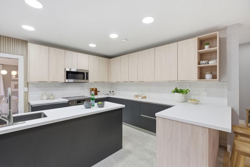 - Countertop - Quartz, Garbage Disposal, Hood Over Range, Island, Island with Sink, Oven Range - Built-In, Refrigerator