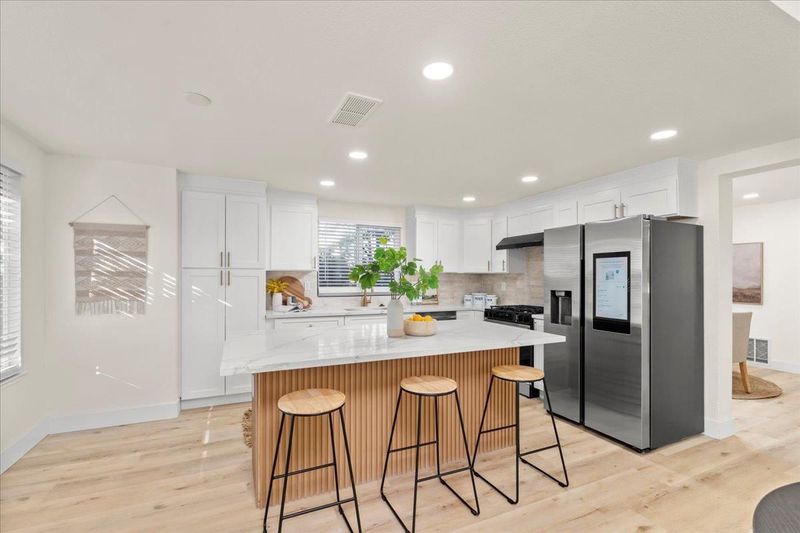 This expansive corner-lot home offers approx. 2,366 sq ft of beautifully updated living space on a generous ~7,492 sq ft lot — designed for modern comfort and effortless living. From the moment you arrive, you’ll appreciate the enhanced curb appeal with fresh exterior paint, a brand-new roof and thoughtful landscaping. Step inside to discover a complete high-end remodel throughout using premium materials: every wall is freshly painted, major mechanicals like the HVAC system and furnace are brand-new, and both the kitchen and bathrooms are finished with stylish contemporary touches and top-tier fixtures. The open, flowing layout is ideal for relaxed daily living or entertaining friends and family. Outside, the large yard is a standout feature with beautifully maintained fruit trees including 2 lemon, 1 lime, 1 persimmon, 2 pomegranate, 1 orange, 2 apple, 1 grapefruit and 1 olive, complemented by roses and lush outdoor space. There’s also potential RV parking, adding versatility and appeal. Enjoy outdoor dining, play, gardening or simply relaxing in your private outdoor haven. Truly turnkey and ready for you, this one checks all the boxes for space, style and sophistication without sacrificing convenience or ease.