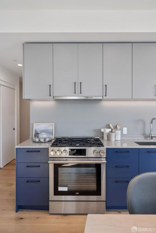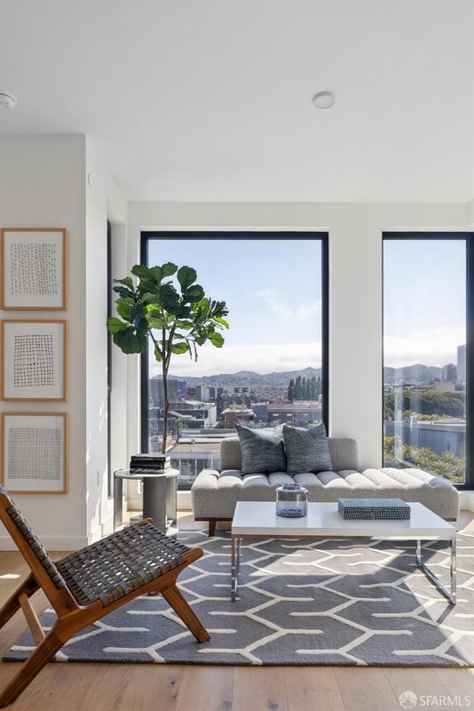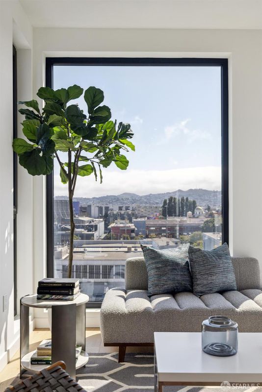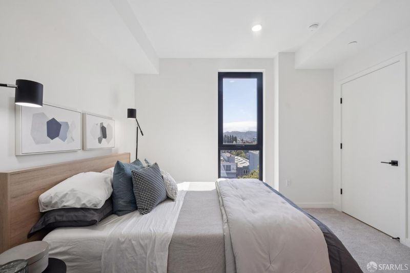 Top-floor corner 2BD/2BA residence with one parking space and expansive west-facing views toward the skyline, Twin Peaks, and Sutro Tower. Oversized windows capture vivid sunset skies while filling the home with natural light. The split-bedroom layout provides separation and flexibility, and the open living area connects to a kitchen finished with quartz countertops, white oak flooring, a gas range, and an integrated Bosch dishwasher. Double-pane windows and central air conditioning and heating ensure comfort throughout the year. Residents enjoy an attended lobby and a rooftop terrace with panoramic city views, seating areas, outdoor grills, and a dedicated dog relief area. Secure bicycle storage and smart entry via the Latch system complete this thoughtfully designed home.