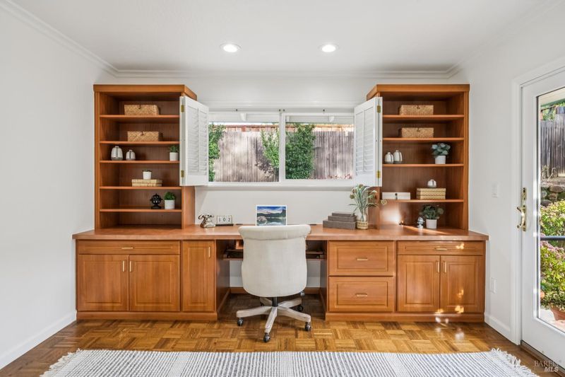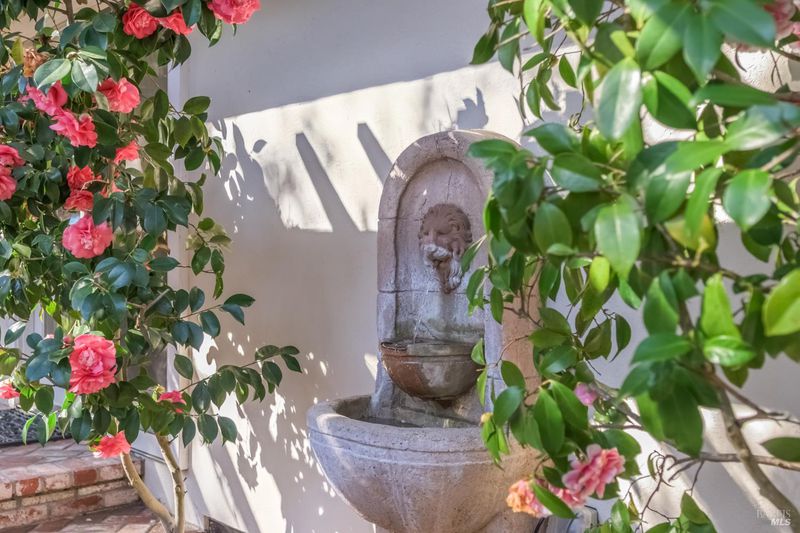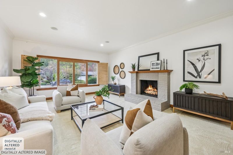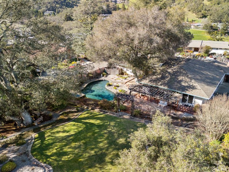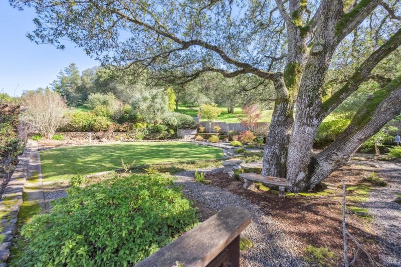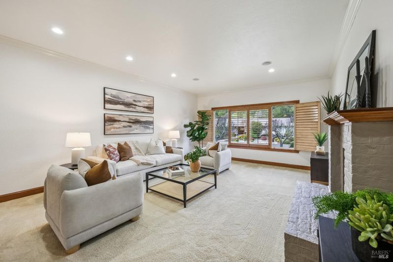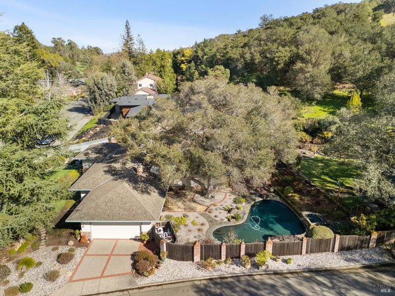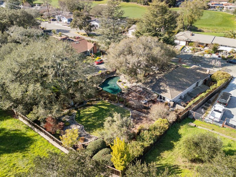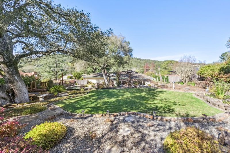 A special find in Marin Country Club, this single-level 4-bedroom, 2-bath home sits on a rare corner double lot offering space, privacy, and exceptional outdoor beauty. Inside, a large step-down living room with a fireplace and formal dining room create inviting spaces for entertaining, while the Mediterranean-inspired kitchen opens to a cozy step-down family room with its own fireplace and built-in shelving. One bedroom is thoughtfully designed as a dedicated office with custom built-ins. The primary suite enjoys direct access to the phenomenal backyard, featuring a lovely pool with an attached hot tub, beautiful rose gardens, and a park-like setting shaded by gorgeous heritage oaks. A pergola-covered brick patio is perfect for gatherings, while the upper parcel offers a tranquil koi pond with waterfall, a large grassy area, and open space beyond - truly a gardener's paradise!