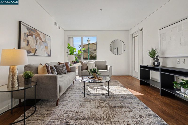 Welcome to this bright, south-facing 2-bedroom, 2-bath residence at The Mercer in the heart of Walnut Creek. Set several feet above the street and filled with natural light, this “like-new” home features its own private rear entrance—ideal for dog owners. No need to walk through the building to come and go. A fenced, oversized patio facing Trinity Avenue offers the perfect spot for relaxing in the sunshine. Inside, attractive interiors feature luxury vinyl flooring in a warm walnut tone and fresh designer white paint throughout. the grout in the bathrooms and kitchen has been professionally refurbished as part of the recent upgrades, enhancing the home's crisp move-in-ready appeal. The open kitchen overlooks the living room and includes a Sub-Zero refrigerator, Bosch dishwasher, stone counters, microwave, and gas range. A separate laundry room offers a full-size washer and dryer with added storage. Community amenities include a lap pool, spa, fitness center, and multi-purpose room. Just steps away, excellent restaurants, eclectic shops, and the Lesher Center for the Arts provide endless options for dining, entertaining, and culture in this vibrant downtown setting. A wonderful place to call home.