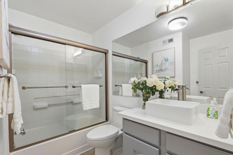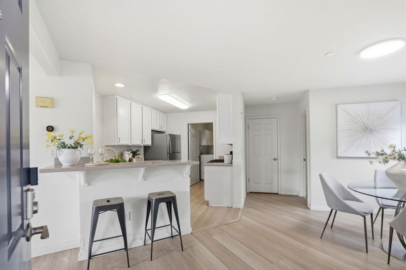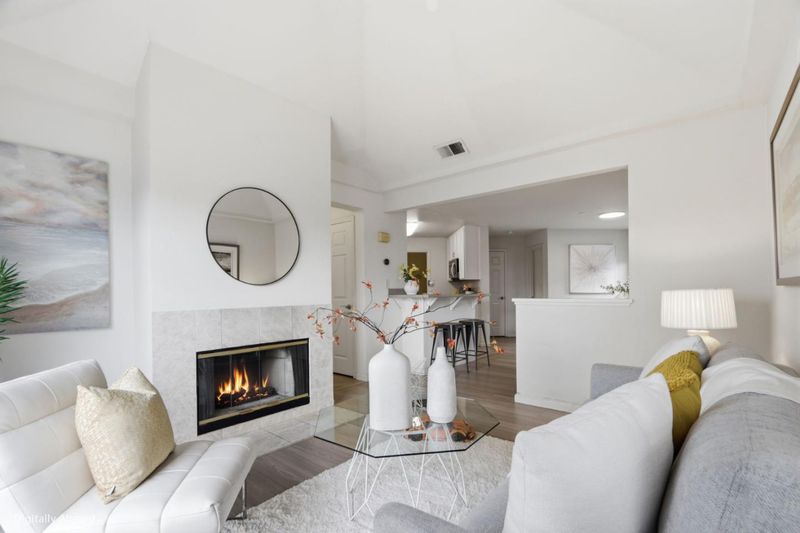 Bright top-floor corner unit in Arcadia Terrace, offering a quiet interior location and abundant natural light. This 3-bedroom, 2-bath condo features approximately 1,300 sq ft with soaring vaulted ceilings, a tiled fireplace, and updated wood-look vinyl plank flooring throughout. The primary suite includes a walk-in closet and refreshed bathroom. The kitchen offers stainless steel appliances, including a newer dishwasher, Corina countertops, and refinished cabinetry. Sliding doors open to a private patio with peaceful treetop views. Additional features include smart home enhancements, a private garage with automatic opener, and one assigned parking space. Community amenities include a pool, play area, gazebo, and HOA covers water and trash. Conveniently located near major tech employers, shopping, dining, and with easy access to Highways 101, 237, and Central Expressway.