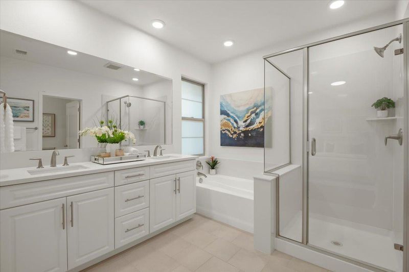- Double Sinks, Primary - Stall Shower(s), Shower and Tub, Solid Surface, Stall Shower, Tub in Primary Bedroom