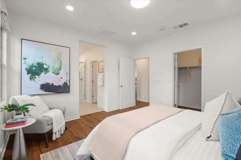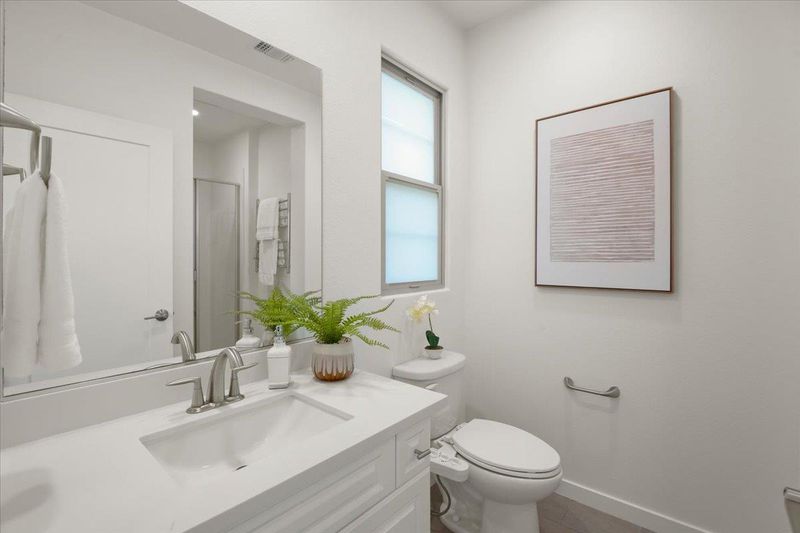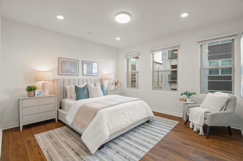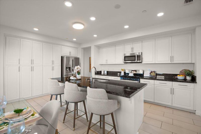 Lot Premium. Model Premium. Elevated Living. A rare opportunity to own a top-floor corner residence defined by privacy, light, and sweeping mountain views. Chosen as both a Lot Premium and Model Premium, this home offers no front neighbors, creating an open, airy setting with breathtaking sunsets and serene surroundings. Nearly 1,900 sq ft of thoughtfully designed space unfolds with soaring ceilings, rich wood flooring, and a seamless open-concept layout filled with natural light. At its heart, the chef's kitchen impresses with a grand island, granite countertops, stainless steel appliances, and abundant cabinetry, perfect for both entertaining and everyday elegance. The primary suite is a true retreat, featuring a spa-inspired bath with dual vanities, soaking tub, and walk-in closet. A private secondary en-suite adds versatility for guests, work-from-home, or multigenerational living. Enjoy a view-facing balcony, central AC, tankless water heater, and attached 2-car garage. Ideally located near premier shopping, dining, parks, BART, major highways, and leading tech campuses. A distinctive blend of premium positioning, modern design, and refined living, this home is truly exceptional.