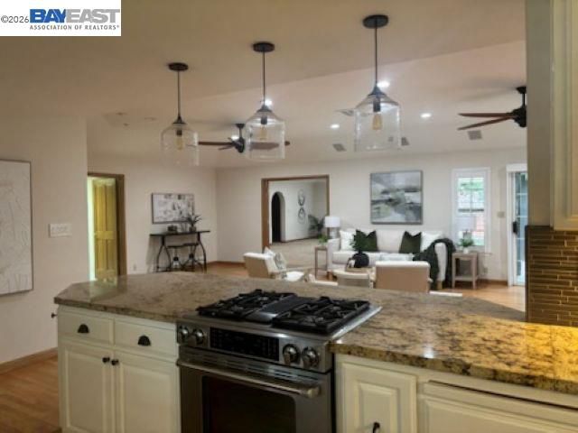 - Dishwasher, Gas Range, Range, Refrigerator, Trash Compactor, Dryer, Washer, Gas Water Heater, Breakfast Bar, Counter - Solid Surface, Stone Counters, Eat-in Kitchen, Disposal, Gas Range/Cooktop, Kitchen Island, Range/Oven Built-in, Updated Kitchen