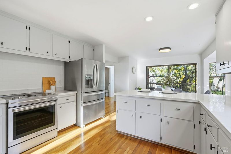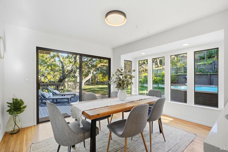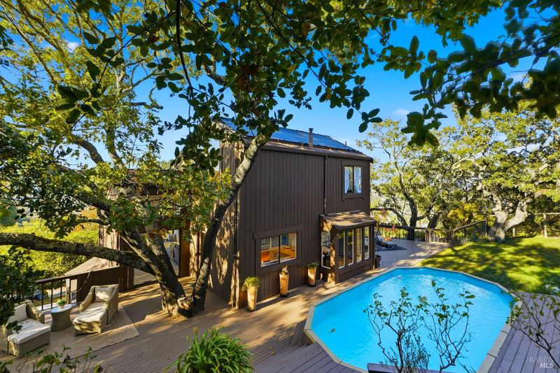 Discover a one-of-a-kind, artist-designed home in Novato Heights. This multi-level retreat boasts 180-degree panoramic views, soaring ceilings, and an abundance of light and ambiance. Nestled on a sunny half-acre lot with mature oak trees & terraced gardens, the private and captivating grounds feature a fenced backyard, a large wraparound entertaining deck, a flat lawn, and a pool. Walk inside from your serene backyard to the main living level, where you will find an open & bright kitchen and dining room that flow into the living & family rooms, both with vaulted ceilings, fireplaces, walls of windows, and sweeping views. Each room showcases its own unique view, from the Novato hills to Mt. Burdell to the Petaluma hills & beyond. Upstairs is a primary suite with a vaulted ceiling, updated bathroom with dual vanities, a walk-in closet, a laundry room, and views to enjoy as you wake in the morning. The lower level offers two more bedrooms, a full bath, and a private entrance - a possible ADU scenario. Lovingly maintained, this home reflects true pride of ownership. Newly updated features include fresh paint, quartz counters, stainless-steel range, lighting, flooring, and new A/C unit. Experience ultimate seclusion & rural charm just minutes from quaint downtown Novato at 395 Ridge.