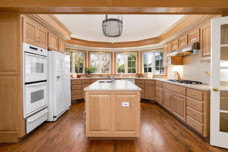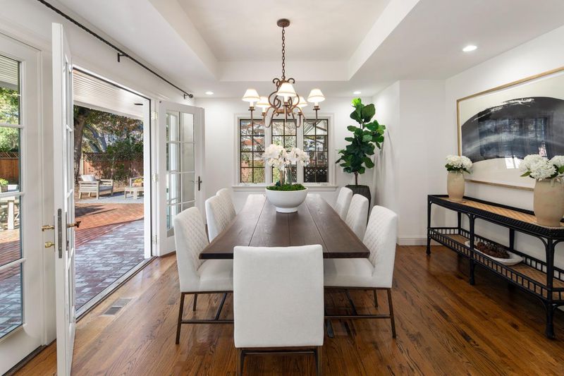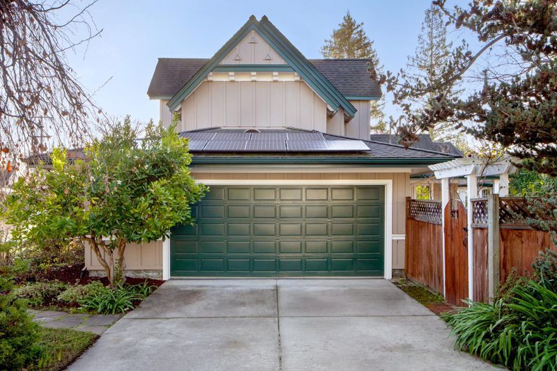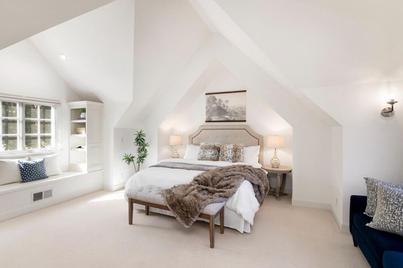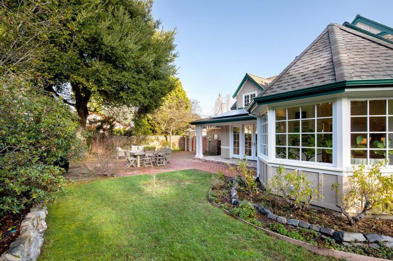 This prime Central Menlo Park home sits on a highly desirable street, on an extra-large corner lot with expansive front and back yards. Move-in ready, it blends timeless elegance with sophisticated California living. Main level: spacious primary suite with beamed ceilings, walk-in closet, generous bathroom (with cathedral ceilings and jetted tub), and French doors to a large private deck shaded by romantic trellis. Adjacent is a versatile large 4th room with double French doors-ideal as office, nursery, or guest space. Upstairs: two extra-large bedrooms with high peaked ceilings, open hallway with built-ins, window seat under soaring ceilings, and spacious bathroom. Vaulted ceilings and fine moldings throughout. Formal entry to living room with soaring ceilings and large rounded sunroom with French doors-perfect for office, dining, or addtl. seating. Large formal dining room with soffit ceiling and wall of French doors to backyard. Kitchen has center island, dining nook, semicircular windows with panoramic views. Gardens feature spectacular specimen rhododendrons curated by the owner, a renowned expert, blooming vibrantly into a colorful, tranquil oasis. Extra-large attached 2-car garage. In central Menlo Park, moments from Stanford, easy Silicon Valley access, top-rated schools.