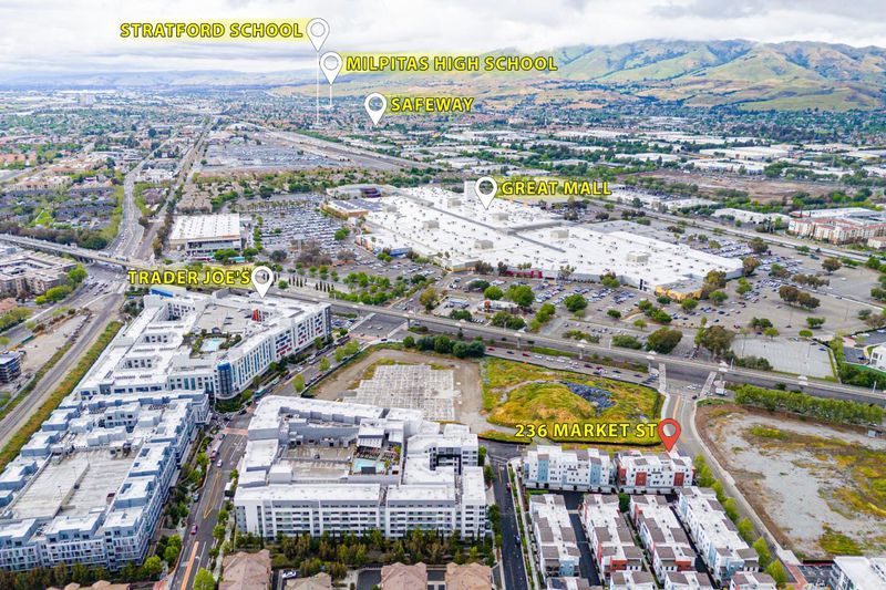 *Dramatic high ceilings, mountain views, top-rated schools, and a corner-unit setting define this exceptional 7-year-new home with bright, open living. Natural light fills the living, dining, and kitchen areas, which flow seamlessly to a private patio.*The kitchen features a large center island, ample cabinetry, sleek backsplash, premium stainless steel appliances, and a Thermador stove. A rare ensuite bedroom is located on the main level. Upstairs, a spacious family room or loft opens to a covered patio. *The primary suite offers mountain views, dual sinks, a walk-in closet, and extra storage. Upgrades include recessed lighting, multi-zone HVAC, and in-home laundry. *A 2-car garage includes storage and an EV charger. Owned solar (8 panels) with battery backup installed ~Dec 2025. Prime location, walk to Great Mall and Trader Joes; minutes to Costco, 99 Ranch, and H Mart. Easy access to BART, VTA, and Highways 880/680. Top-rated schools: Mabel Mattos (10/10), Rancho Milpitas (9/10), Milpitas High (9/10) per GreatSchools. Near major employers like NVIDIA, Google, Apple, Supermicro, and Cisco